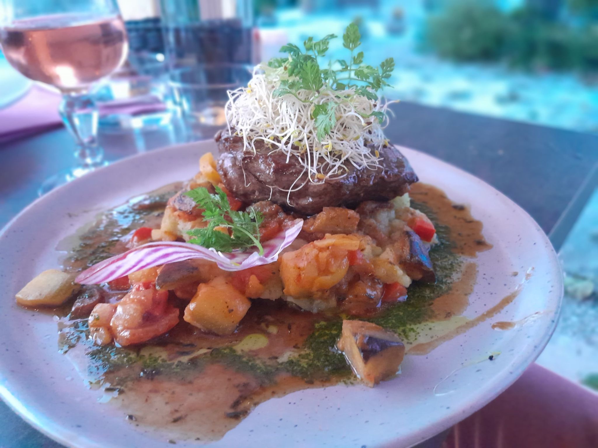 Nous ne savons que choisir devant la carte alors nous prenons le temps de réfléchir avec un rosé local Domaine Eybro des hauteurs du lac de Lescouroux à Soumensac, sucré mais pas trop, frais...